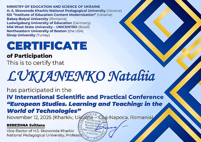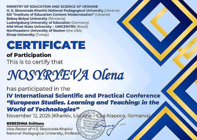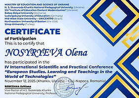 Cтарший викладач кафедри іноземних мов Носирєва Олена Валеріївна та викладач Лук'яненко Наталія Миколаївна взяли участь у IV Міжнародній науково-практичній конференції англійською мовою “European Studies. Learning and Teaching in the World of Technologies”, організованій кафедрою теорії і практики англійської мови та зарубіжної літератури імені професора Михайла Гетманця. За результатами участі викладачі отримали сертифікати учасників конференції, що підтверджують їхню активну наукову діяльність та прагнення до впровадження сучасних технологій у навчальний процес.