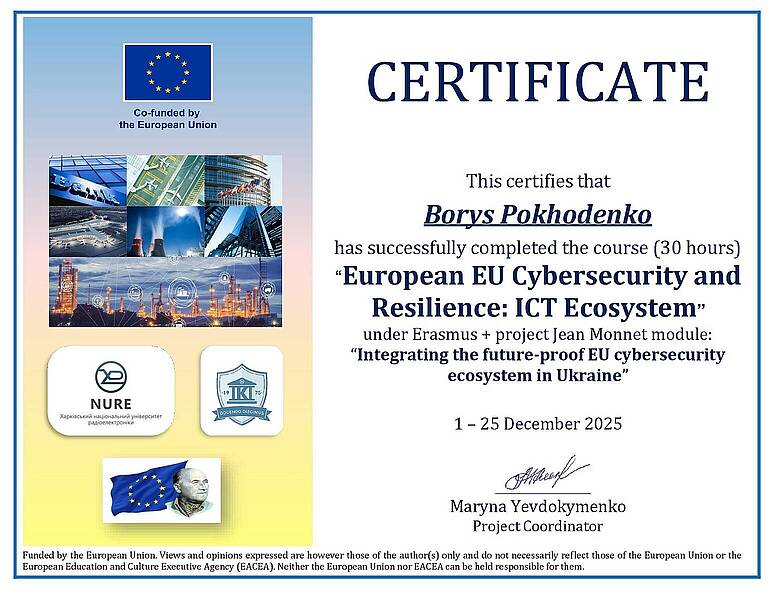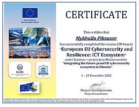 Курс «European EU Cybersecurity and Resilience: ICT Ecosystem» проходив у період з 1 по 25 грудня 2025 року. Навчання відбувалося під егідою модуля Jean Monnet: «Integrating the future-proof EU cybersecurity ecosystem in Ukraine».