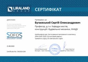 Викладачі кафедри мостів, конструкцій і будівельної механіки ім. В.О.Російського, які проходили корпоративне навчання   в провідній компанії LIRALAND з базового курсу ЛІРА-САПР і отримали сертифікати (проф. Бугаєвський С.О., доц. Овчаренко О.А, доц. Безбабічева О.І, доц. Смолянюк Н.В., доц. Волох В.О, доц. Синьковська О.В, ас. Вербицький К.І.) отримали  можливість дистанційного навчання студентів  з застосуванням ліцензійної актуальної версії ЛІРА-САПР2024.
