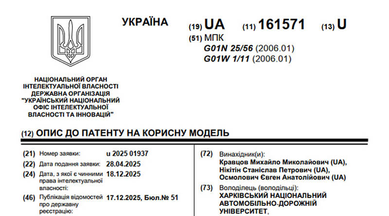 Номер заявки u 2025 01937, публікація відомостей про державну реєстрацію: 17.12.2025, Бюл. №51.