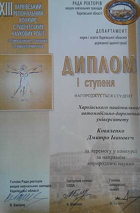 Вітаємо Коваленка Дмитра з отриманням диплома І ступеня за перемогу у ХІІІ Харківському регіональному конкурсі студентських наукових робіт за напрямом "природничі науки". Його робота була присвячена створенню калькулятора для розв'язування систем лінійних нерівностей точними та неточними методами за допомогою Microsoft Excel. Частково результати цієї роботи також були представлені на Всеукраїнській конференції, що проходила на базі кафедри вищої математики ХНАДУ. З ними можна ознайомитись у збірнику конференції.