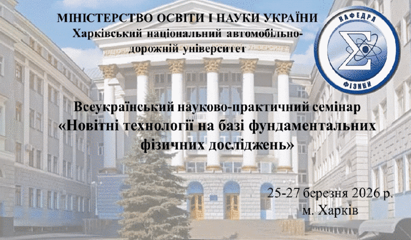 25-26 березня 2026 року у ХНАДУ на кафедрі фізики відбувся Всеукраїнський науково-практичний семінар «Новітні технології на базі фундаментальних фізичних досліджень». В роботі семінару прийняло участь 85 учасників, серед них 27 викладачів ХНАДУ, 28 студентів і 11 аспірантів. Доповіді представили також 19 учасників інших ВИШів і наукових установ. Для обговорення було представлено 42 доповіді.