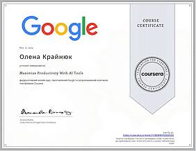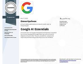 Спеціалізація «Google AI Essentials» була підготовлена компанією Google та є свідченням того, що її учасники набули ключових навичок у сфері штучного інтелекту. Зокрема, спеціалізація охоплювала такі курси: