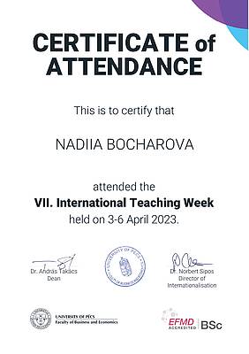 6 квітня 2023 р. к.е.н., доц. Бочарова Н.А. протягом 4 годин провела захоплюючі лекції з дисципліни «Управління змінами» онлайн англійською мовою. Її активний внесок та віртуальна участь у семінарах отримали високу оцінку Міжнародного комітету UPFBE та за результатами участі видано Сертифікат.
