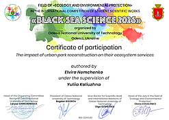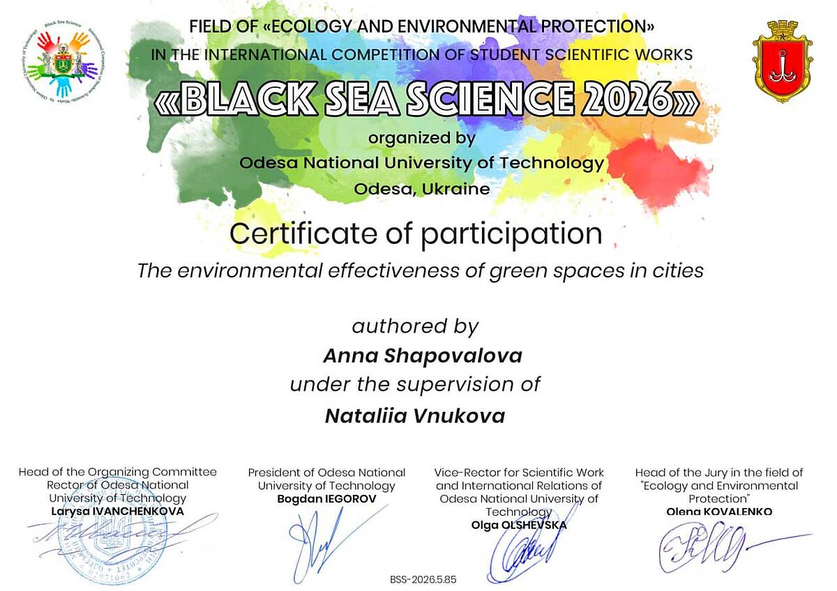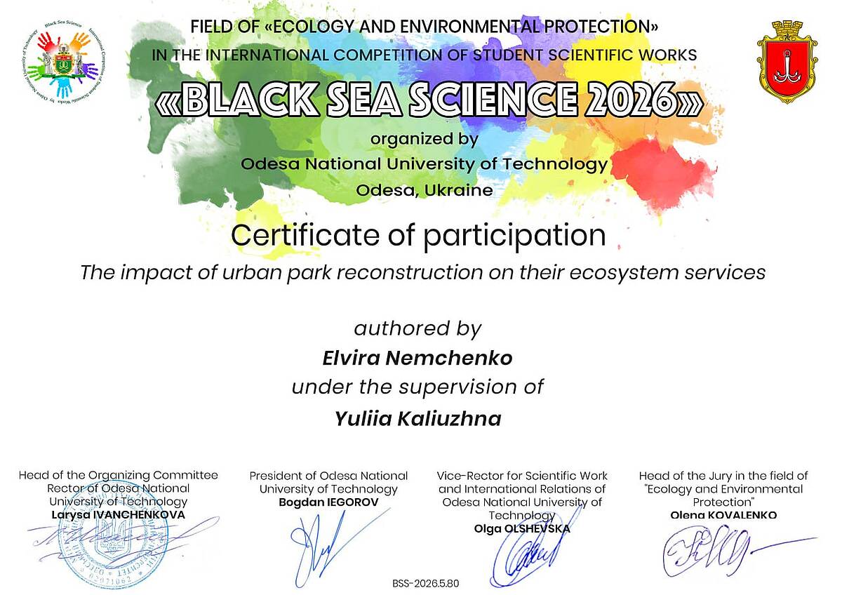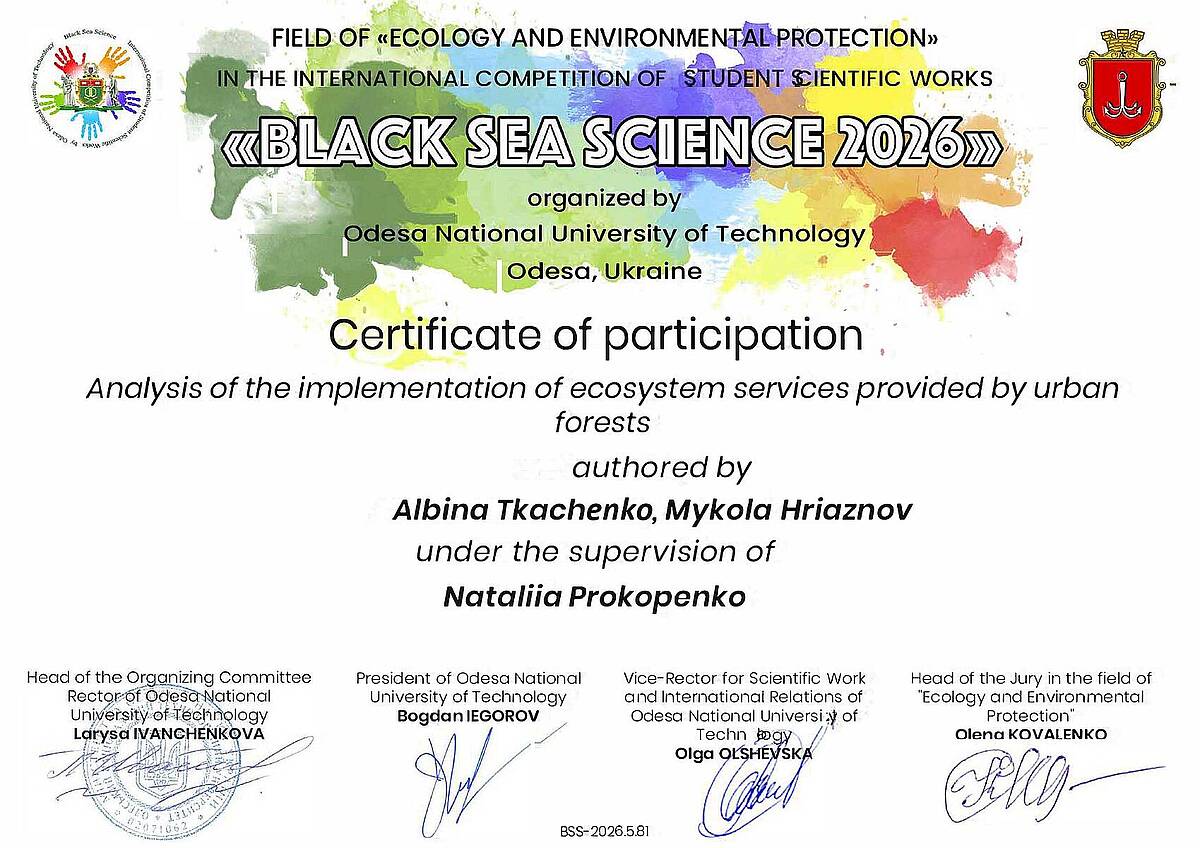 Здобувачі Альбіна Ткаченко і Микола Грязнов представили роботу «Analysis of the implementation of ecosystem services provided by urban forests» (науковий керівник доцент Прокопенко Н.В.), Анна Шаповалова представила роботу «The environmental effectiveness of green spaces in cities» (науковий керівник професор Внукова Н.В), Ельвіра Немченко представила роботу «The impact of urban park reconstruction on their ecosystem services» (науковий керівник доцент Калюжна Ю.С.) отримали сертифікати учасників.